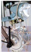 外部光センサー付きライト(写真の上側)と、車軸に組み込まれた発電機(写真の下側)を組み合わせた製品です。常に発電機は回っているのですが、車軸にあるために抵抗をほとんど感じません。ですから、まわしっぱなしにしていても、まったく気になりません。走っていても、私の自転車のほうが他の人よりも抵抗無く走っているようで、いろいろな人が一生懸命漕いで入っているのに、私は惰性で走っていられるほどです。