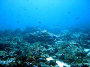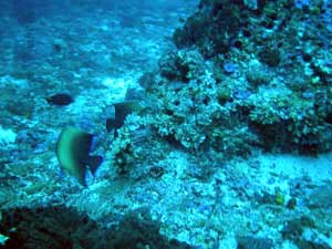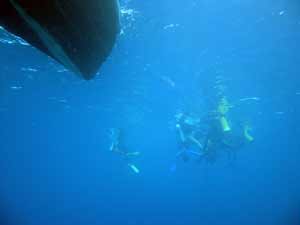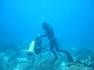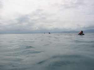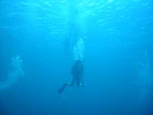 私も急いで泳いで行きました なにも見つからず、後で榎本さんに聴いたところ サメがニ匹いたそうです・・・(^^; |