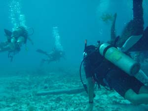 エントリーした際に、あまりブリーフィングに無かった流れがあり、「なんでも平気さ」といったカップルの男性ダイバーが、後からのエントリーをしているにもかかわらず、流されていってしまいました。あはは・・・・(^^;・・・・カッコつける前に、海とか見とけよ、波がこんなふうにゆるいときは、流れがちょっとは速いものなの・・・