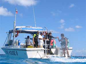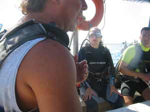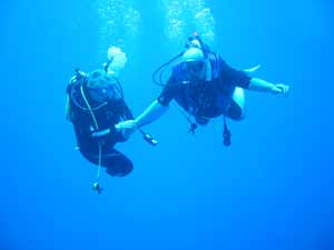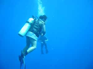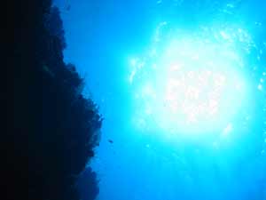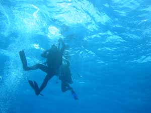 あんまりのんびりしたダイビングだったので、エアがほとんど減りませんでした。ガイドさんは、今日は多く潜るようで、ナイトロニックス(窒素を減らした人工大気)を使用しているため、潜水時間の調子を塚もかねているようでした。私は、もう飽きたので上がるねと合図したら、ガイドさんも上がることにしたようです。気付いたら、私と、写真のおふたりだけしか、もういませんでした。 |